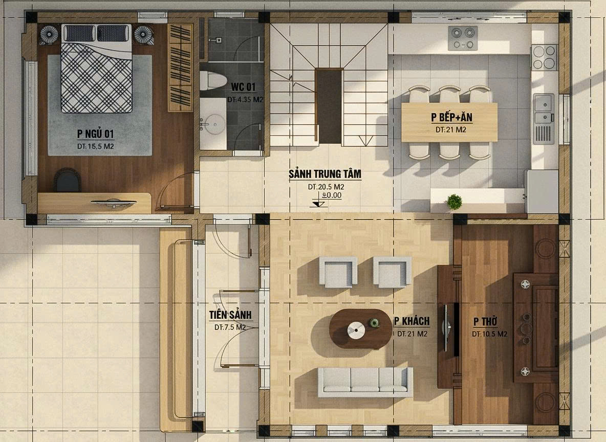 Sảnh trung tâm 20.5 m²: Là trung tâm phân phối, có thể xử lý như foyer nội bộ, tạo trục giao thông ngắn tới phòng ngủ và bếp. Sảnh này có thể kết hợp giếng trời nhỏ để lấy sáng cho lõi nhà.