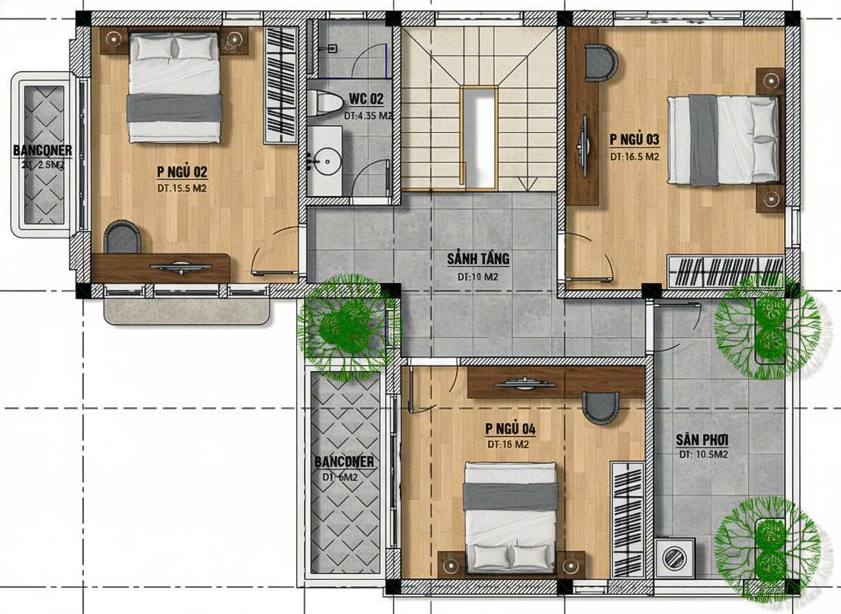 Phòng ngủ 2 — 15.5 m²; Phòng ngủ 3 — 16.5 m²; Phòng ngủ 4 — 15.0 m²: Các phòng có diện tích tương đồng, phù hợp bố trí giường đôi hoặc giường đơn + góc làm việc. Đề xuất cửa sổ đủ lớn để đảm bảo chiếu sáng sâu ≤ 6–7 m từ cửa sổ, hoặc bổ sung cửa thông gió ngang.