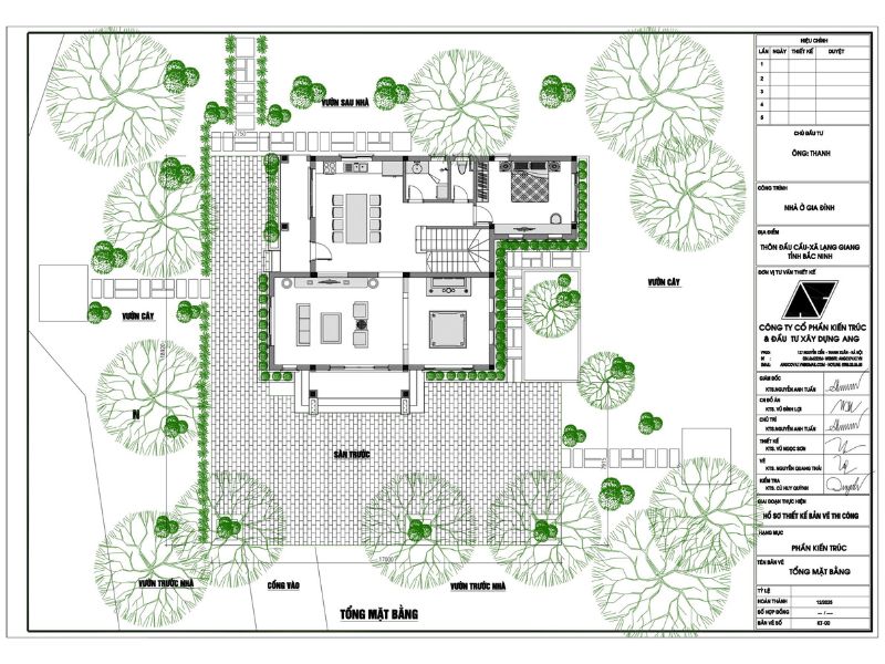 Ở bản vẽ tổng mặt bằng quy hoạch này có thể thấy được ngôi nhà được lùi về phía sau tâm đất, tạo ra một khoảng sân trước vô cùng rộng để có chỗ làm nơi để xe hoặc vui chơi cho trẻ nhỏ. Hệ thống cây xanh được bố trí bao quanh tường rào ở các góc nhà khiến công trình luôn tràn ngập sắc xanh. Bên cạnh đó việc di chuyển cũng trở nên thuận tiện hơn với lối đi được lát đá dạo quanh vườn.
