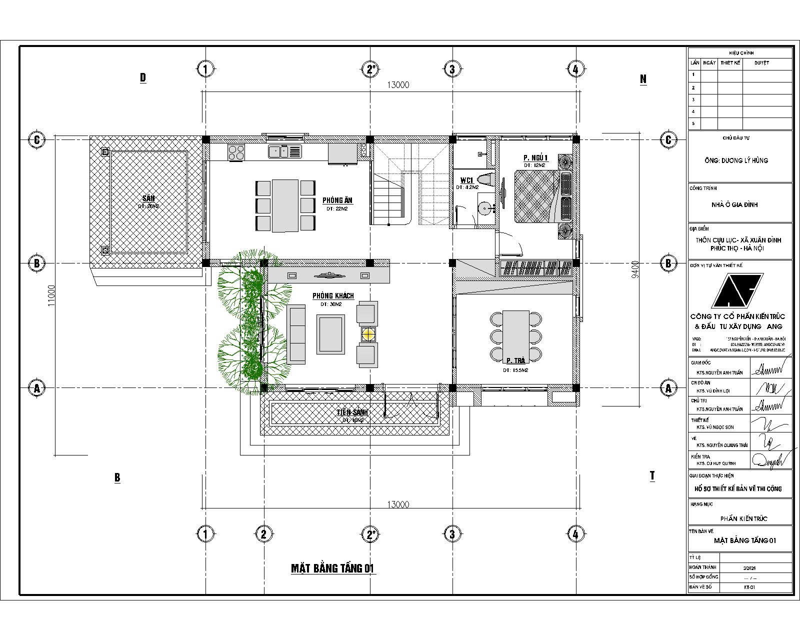 Công trình nhà 2 tầng mái bằng hiện đại của gia đình ông Dương Lý Hùng tại Phúc Thọ – Hà Nội được thiết kế trên diện tích 9x13m, mang đến không gian sống tiện nghi, thoáng đãng và phù hợp với nhu cầu sinh hoạt của gia đình nhiều thế hệ. Dưới đây là bảng phân tích chi tiết diện tích các phòng và đánh giá tổng thể về tính khoa học, tiện nghi cũng như yếu tố phong thủy trong thiết kế.