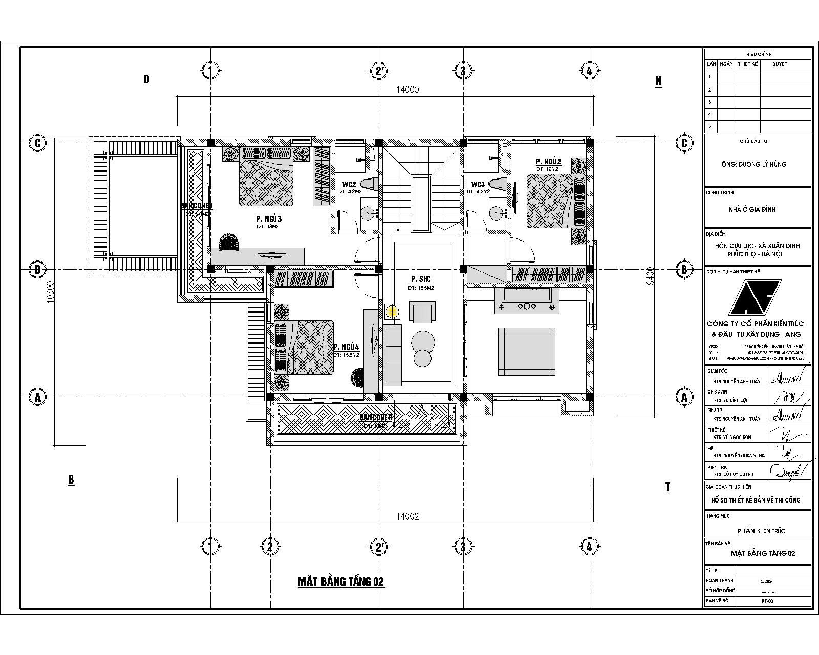 Tầng 2 tập trung vào không gian nghỉ ngơi với 3 phòng ngủ và phòng sinh hoạt chung. Cách bố trí này tạo sự riêng tư nhưng vẫn có không gian kết nối chung cho cả gia đình. Các phòng ngủ đều có cửa sổ hoặc ban công, đảm bảo thông gió và ánh sáng tự nhiên.
