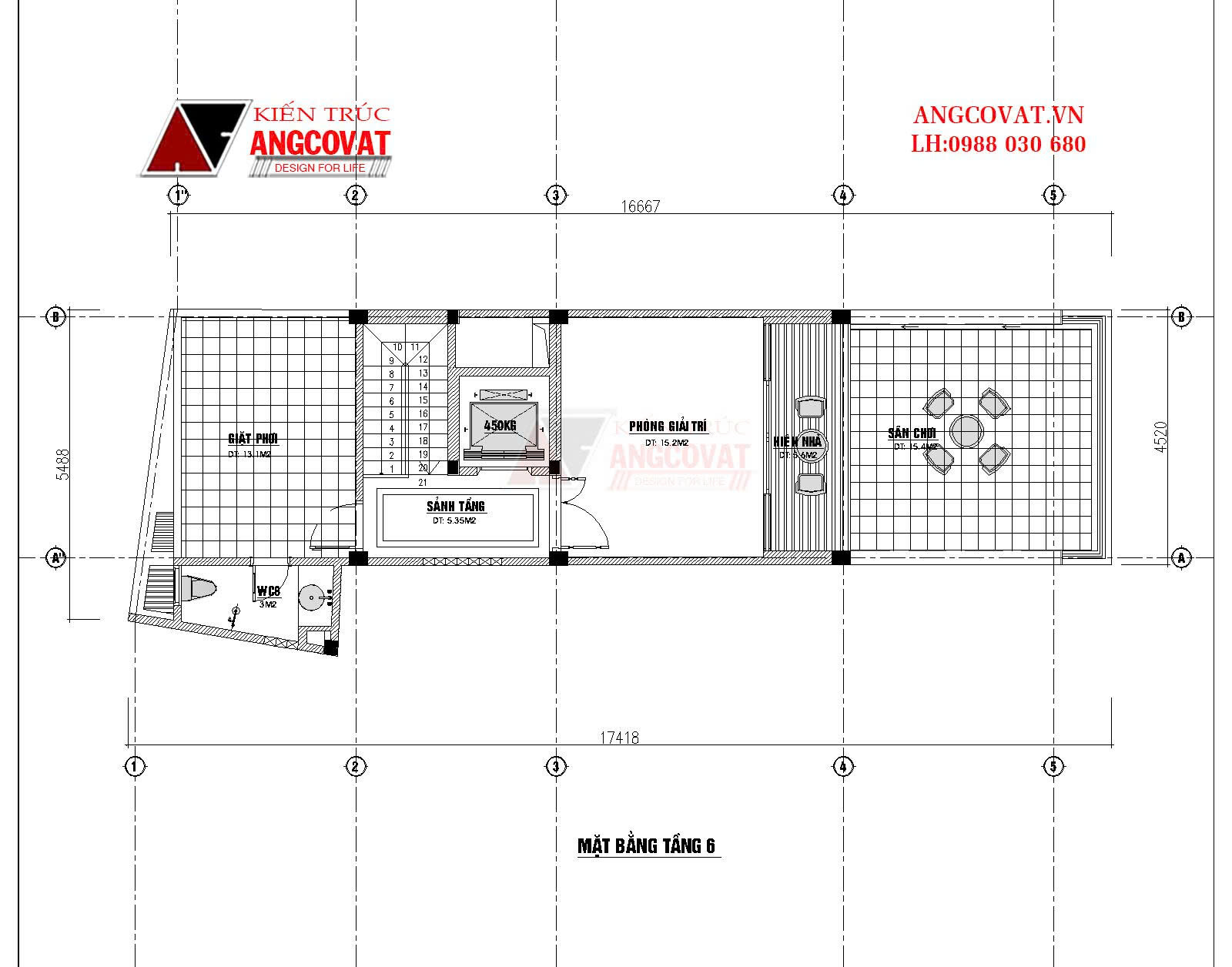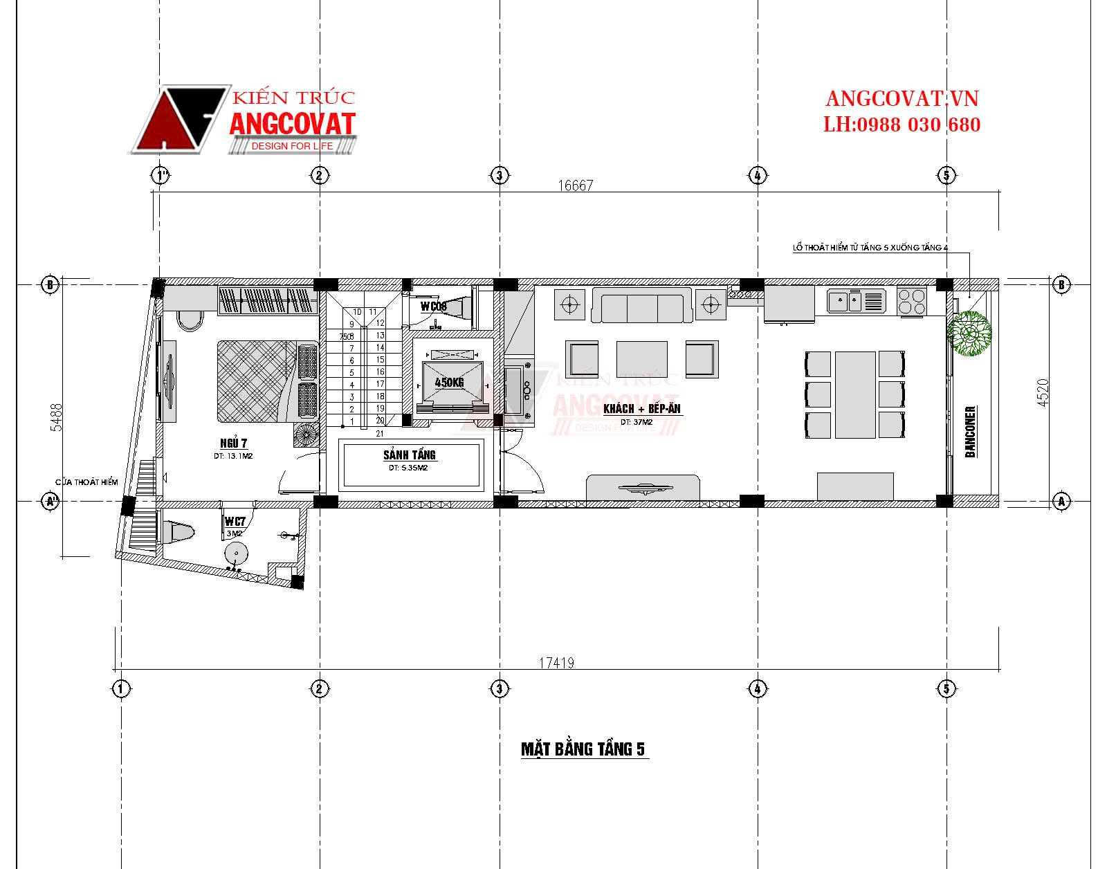Bản vẽ công năng mặt bằng khu vực tầng 5 nhà 4.5x16m2