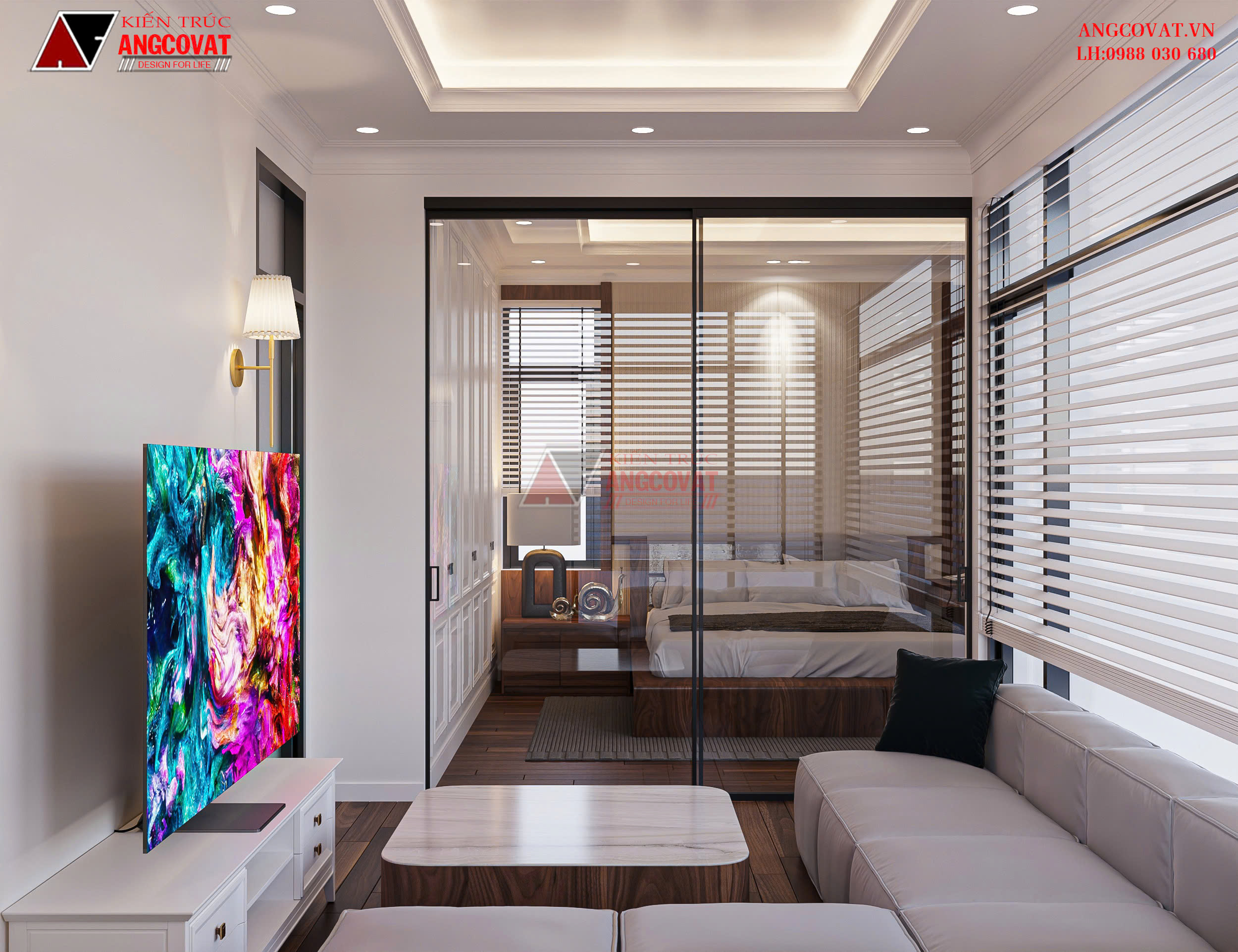 Ngăn cách với phòng ngủ qua vách ngăn kính tạo không gian kết nối liền mạch