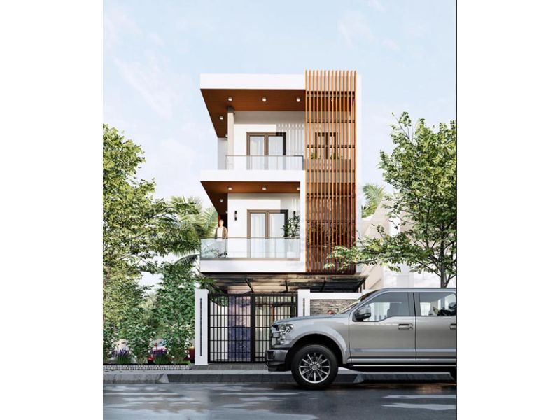 Thiết kế nhà 1 trệt 2 lầu 4x15 sử dụng hệ lam chắn và cửa kính tối ưu ánh sáng tự nhiên
